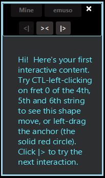 Try clicking the above icon. This lesson will appear split-window, with the lesson left, and the virtual guitar right. A lesson controls box appears. Click on the “lesson full window” button at the far right of emuso, under the small clock, to revert to full screen. Interactions are disabled if the Toolkit is active, and you’ll get a warning message. You can enter the Toolkit when an interaction is active, to do whatever you want, and when you exit the Toolkit, the task you were emgaged with reruns.