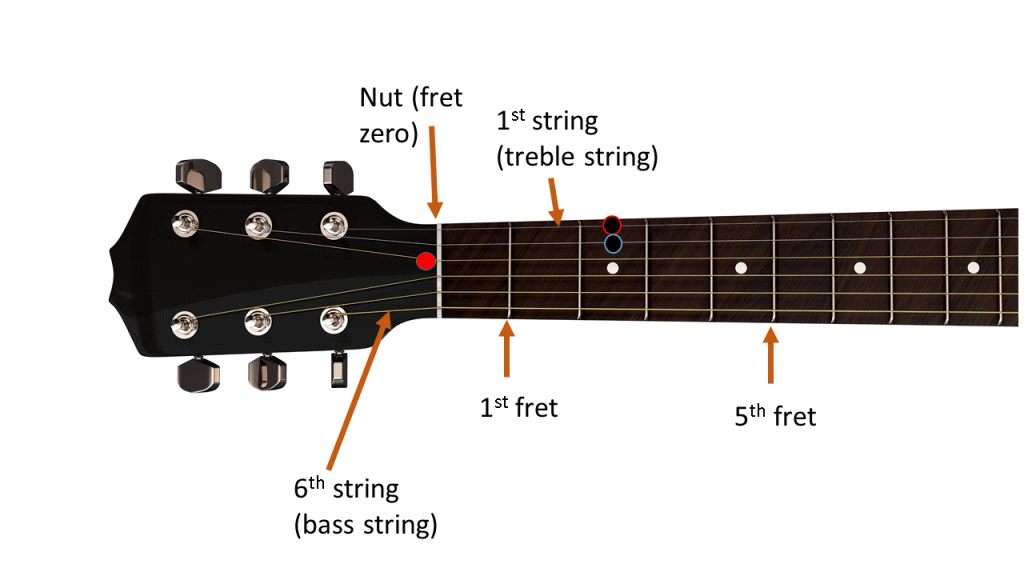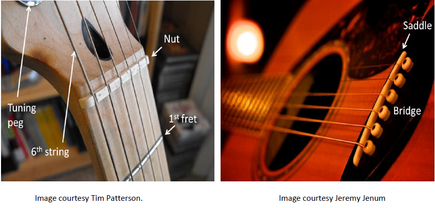 Each guitar string is anchored to the guitar body by a bridge, crosses the saddle there, and runs the length of the guitar neck without contacting any fret, until it contacts the nut. From there the string winds into the tuning head, which can be turned to tighten or loosen the string. This tension can be adjusted until the string matches an agreed upon pitch (we’ll look at this below).